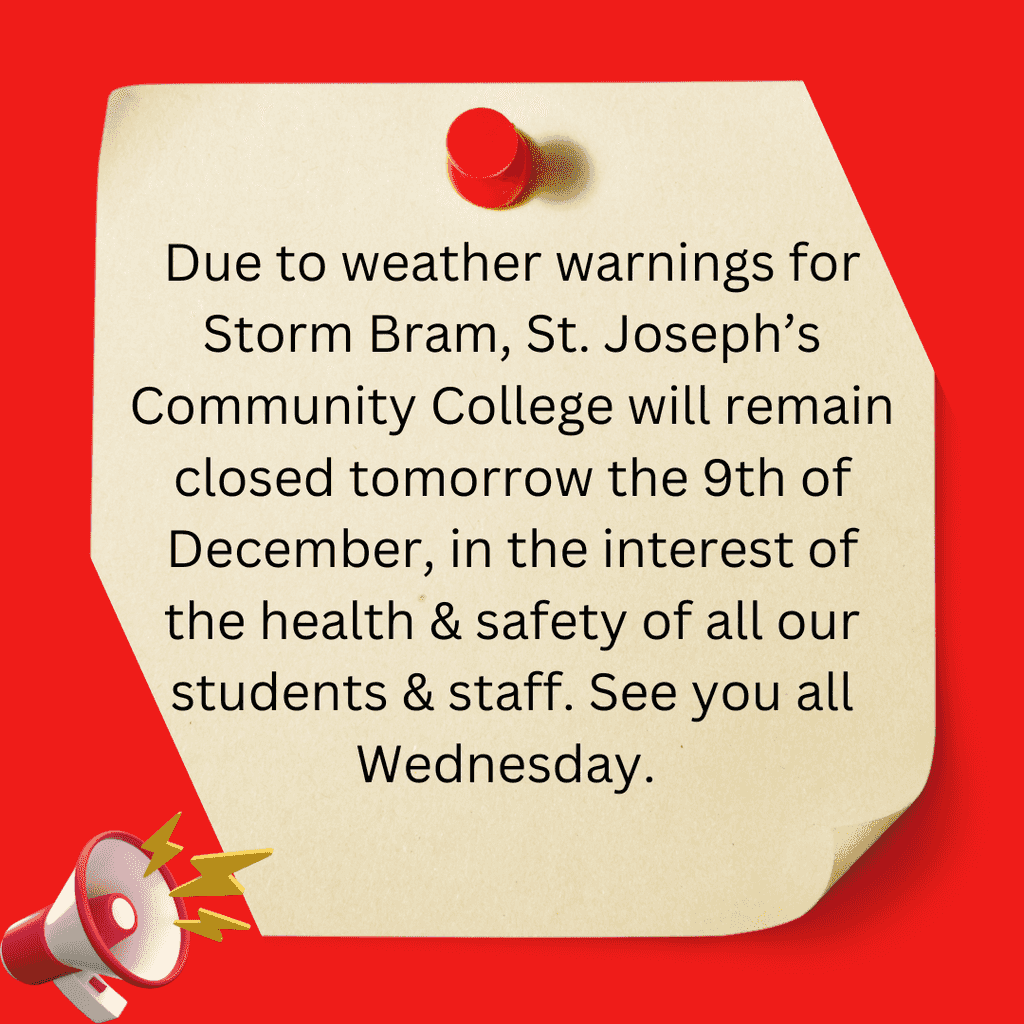 <p><span style="font-family:Calibri, Helvetica, sans-serif;font-size:16px;">St. Joseph's Community College will remain closed tomorrow, Monday, as we come together to honor and attend the funeral of our beloved colleague, Charles.</span><br style="font-family:Calibri, Helvetica, sans-serif;font-size:16px;" /><span style="font-family:Calibri, Helvetica, sans-serif;font-size:16px;">We appreciate your understanding during this time of mourning. May his soul rest in peace.</span></p>